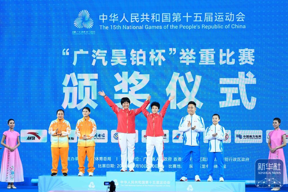 11月10日,在广东东莞举行的第十五届全国举重锦标赛女子49公斤级决赛中,湖南省队的侯智慧获得冠军,海南省队的邓小芳和浙江省队的于梦倩分别获得第二名和第三名。 ^ 冠军湖南队侯志辉(左五)、亚军海南队邓小芳(左三)、季军浙江队于孟强(右二)在颁奖典礼上与教练合影。 ^ 获奖湖南队球员侯志辉(前中)、亚军海南队球员邓小芳(前左)、季军浙江队球员于孟强(前右)在颁奖典礼上与教练合影。 ^ 湖南省队队员侯志辉参加抓举比赛. ^ 陕西队彭天峰抓举比赛后庆祝. ^浙江省队队员于梦茜参加挺举比赛。 ^ 海南队队员邓小芳参加挺举比赛。 ^ 湖南省队队员胡玉婷参加挺举比赛. ^ 抓举比赛海南队队员邓小芳。 ^ 浙江省队队员于梦茜参加挺举比赛.新华社记者 杨成光 供图。