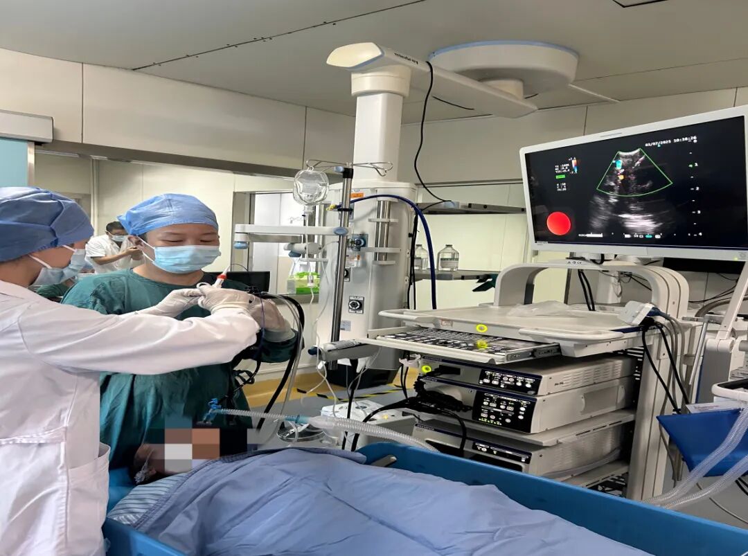 组建了由呼吸内科及重症医学科副主任医师刘军、主治医师邱琪带队的诊疗团队。经过仔细的术前讨论,我们决定在全身麻醉和喉罩下使用超声引导下纵隔针隧道淋巴结活检(EBUS-TBNB)技术。
